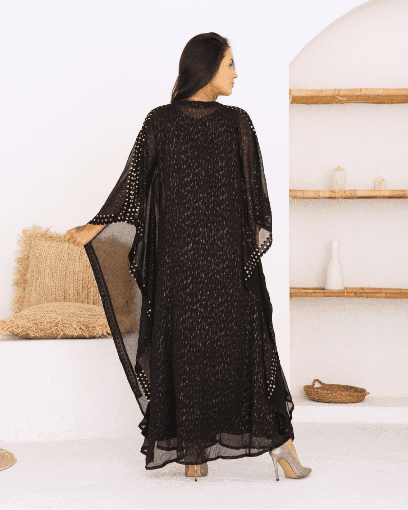 Black kaftan a graceful batwing design that offers a relaxed and flowing silhouette, providing both comfort and style. The loose-fitting sleeves and the draping fabric create a sophisticated and effortlessly chic look.