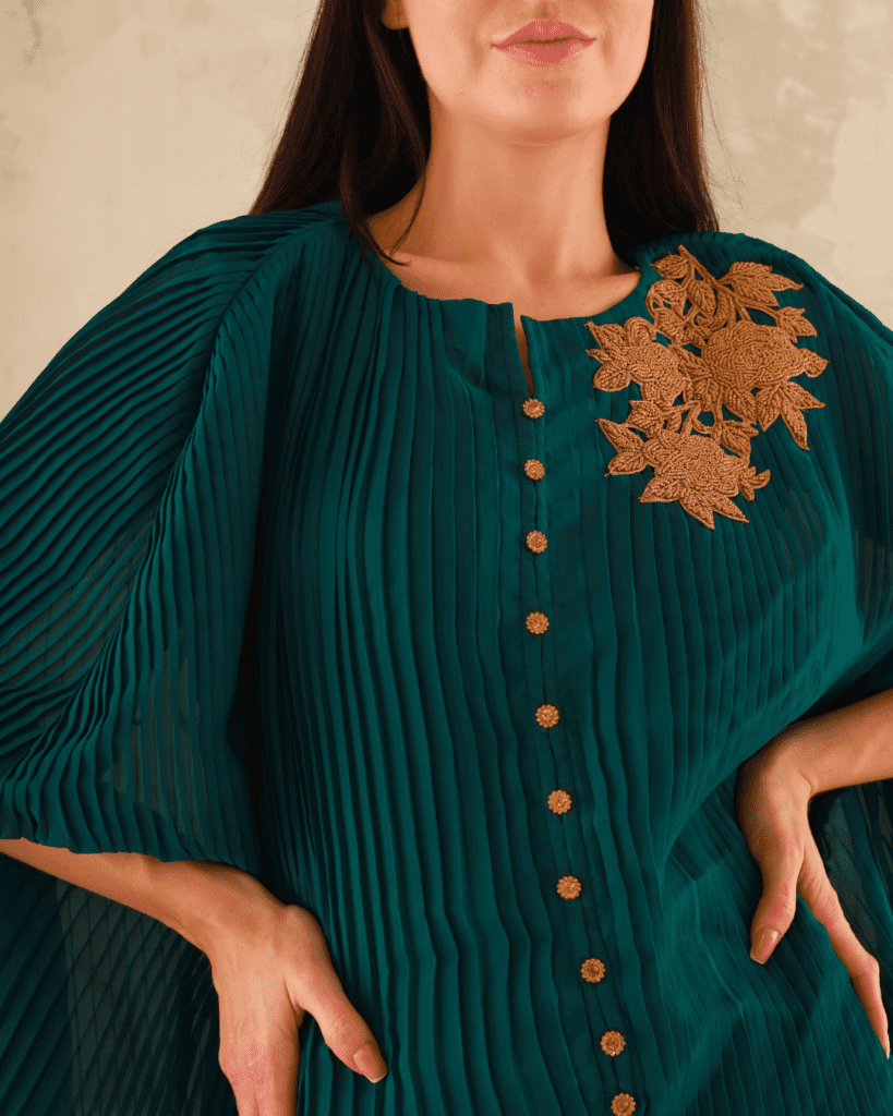 Elevate your wardrobe with our Pleated Kaftan Style Top with Wide Pants in Bottle Green. Experience the perfect blend of comfort, style, and versatility, and make a fashion statement that’s uniquely yours.