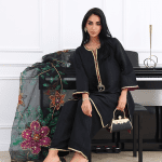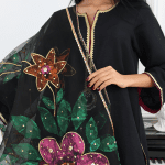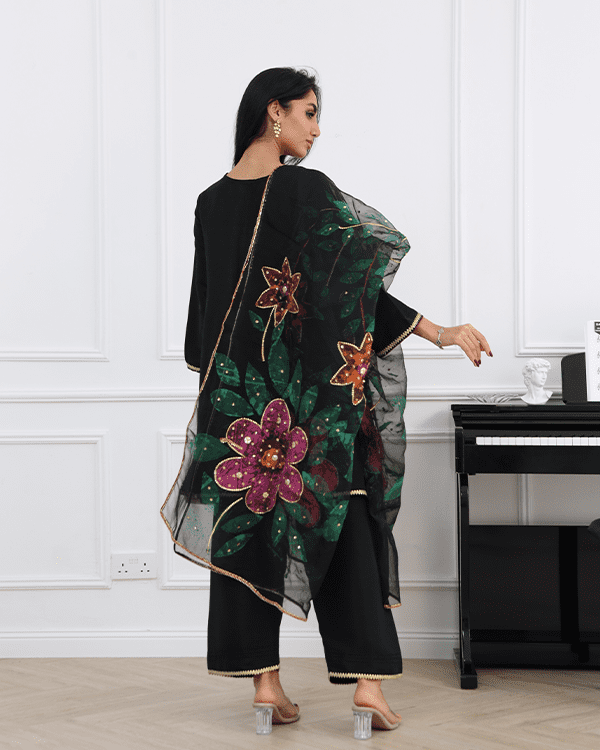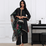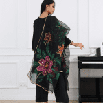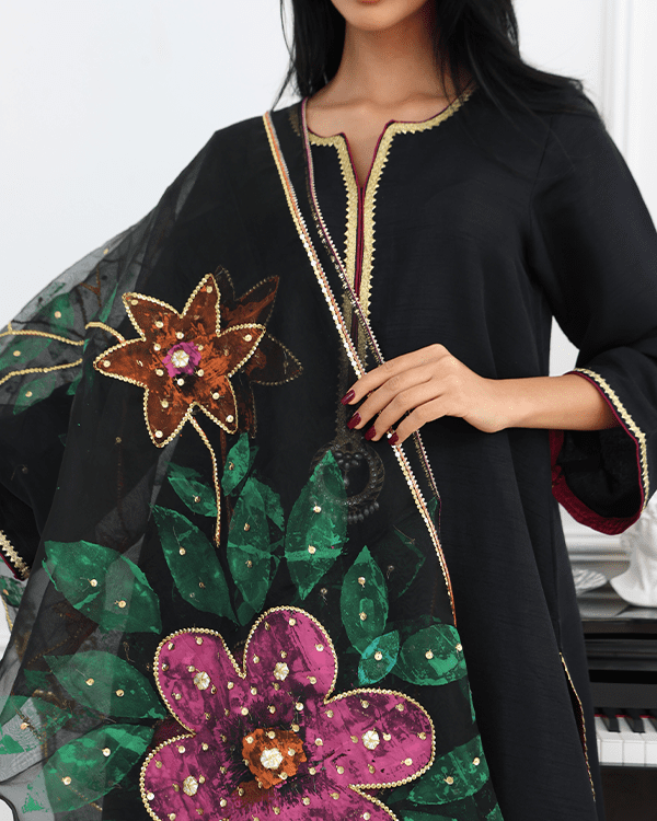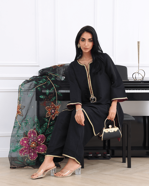 Step into timeless grace with this black three-piece outfit, detailed with delicate gold trimming and maroon accents. Paired with a beautifully hand-embroidered floral dupatta, this look blends traditional charm with modern minimalism — perfect for festive gatherings or elegant evenings.