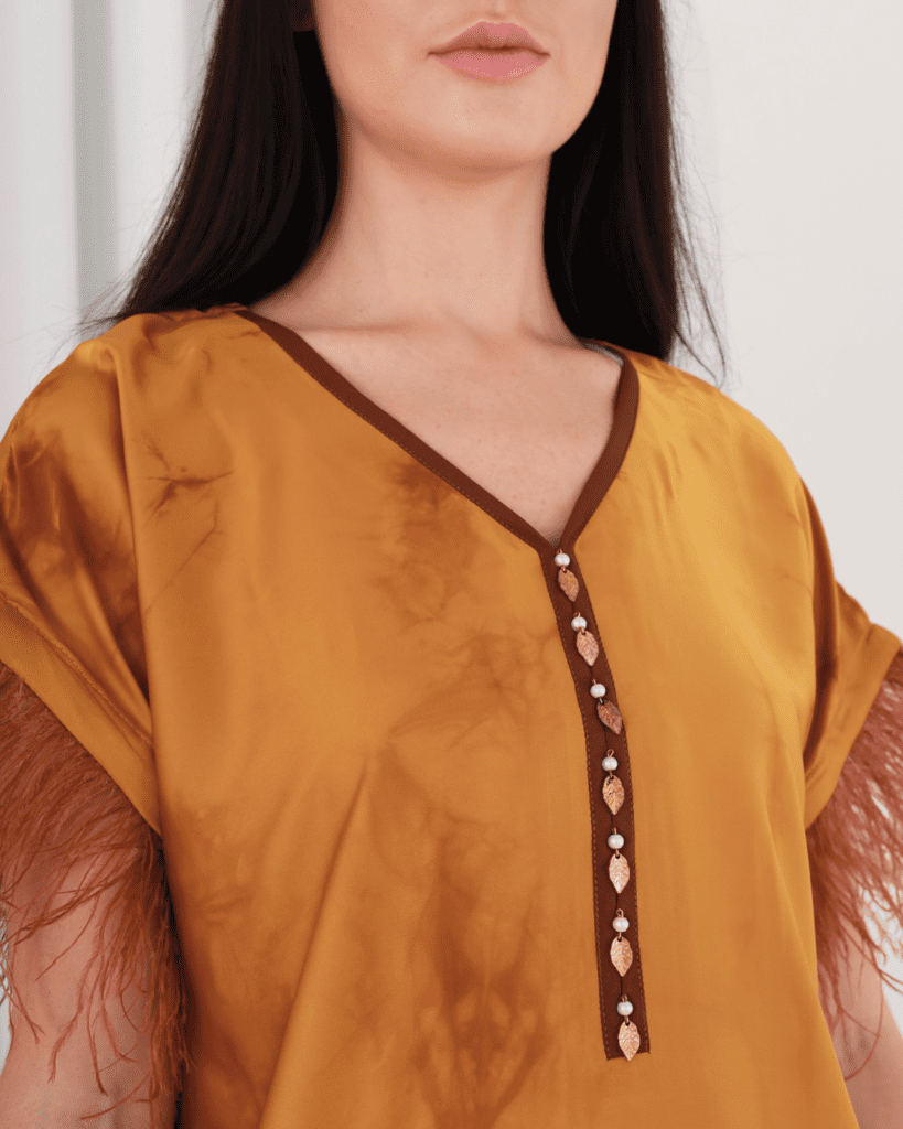 This Tye & Dye Mustard Silk Tunic combines artistry and luxury, featuring a rich mustard hue with a unique tye & dye pattern. Adorned with opulent fur edgings, it offers both warmth and elegance. The flattering silhouette ensures comfort and sophistication, making it perfect for formal events or stylish evenings out. Versatile and easy to style, this tunic is a must-have for adding a chic touch to your wardrobe.